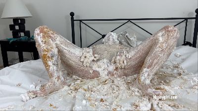 Young Dakota is nude and spread eagle with her pussy in full view while handcuffed to the headboard. She is then pied until she looks like a cream blob.