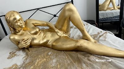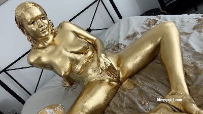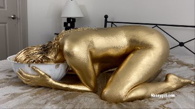 Sexy MILF Sofia is covered in gold paint and then masturbates until she cums. Vert hot stuff from this young mom.