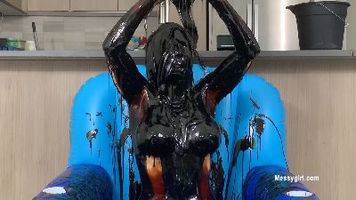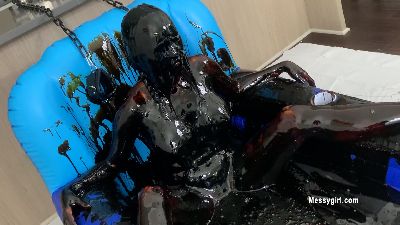 Sexy Zoey is nude and bound as she has 5 gallons of black sticky treacle poured over her.