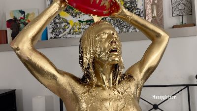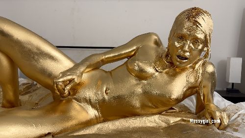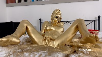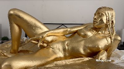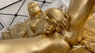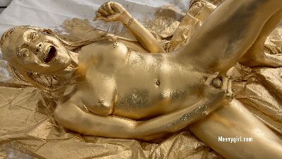 Santana is covered in gold paint for the first time. Once she is covered, she brings out her vibrator and gives herself multiple body twitching orgasms. Hot!