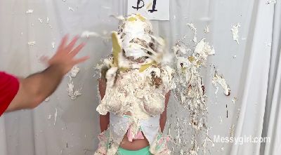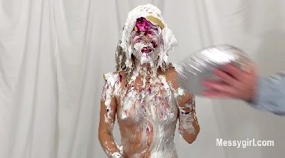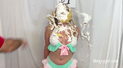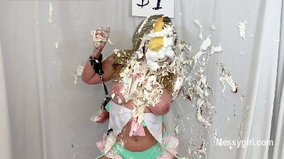 Amy is so excited to have a new job working at the carnival. She is working the pie booth, but unfortunately for her, it will be as a human pie target. Amy is in a cute bikini and her hands are tied behind her back as she sits on a stool. Amy's pretty face is soon obliterated with the hard thrown pies. She tries to keep her dignity as the endless stream of pies keep coming. Her top is pulled off to spice things up. Poor Amy can only sit there and take it. She is a head to toe creamed mess by the time her shift is over.