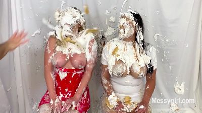 Amy and MewMew are well dressed as they play the game Pie Trivia. Each girl is asked a question and must get the correct answer or they will be pied. Needless to say, there are many pies thrown due to the fact the questions are very difficult. You will love the reactions from both girls as they get their faces creamed with pies. They even are asked to show their boobs and are happy to do it. After the girls are covered in pie slop, they take a shower together. You also get bonus footage as well.