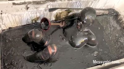 Realtor Sabrina is showing a home she is selling, but is upset to find a bathtub filled with black sludge due to a plumbing issue. She needs to drain it, so she grabs a plunger and attempts to drain the tub. Unfortunately, while she tries to do this, she falls back and face first in the disgusting black sludge.