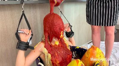 Amy is taking Zoey's food order. Zoey wants to know what the soup of the day is, so Amy tells her slut soup. When Zoey asks what the main ingredient is, Amy tells her she will soon find out. Next we find Zoey topless, sitting in a big bowl and bound to the sink. Amy is now a sexy chef and ready to pour the ingredients over Zoey. Poor Zoey wants to change her order, but it's too late, as Amy pours the savory mess over Zoey's pretty face until she is transformed into a savory blob.