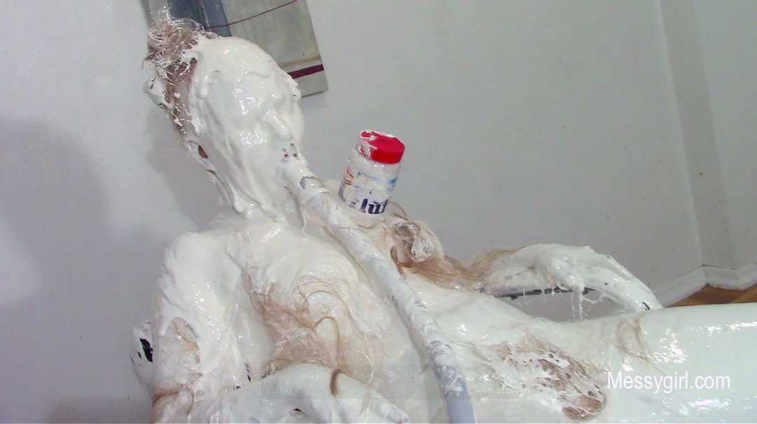 Amy is selling the Messy Boat 2000 and demonstrates all the features. As she talks about the features, she is pied and slimed non stop. During her messy onslaught, the slop starts to collect in the seating area around her. The receptacle at the end of the boat starts to fill up from the slop. Once filled, she proceeds to dunk her head in it. She then spread her legs and places her feet into the built in stirrups for more over the head pours. You get a nice view of her exposed pussy as the slop pours over her face and between her legs.