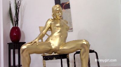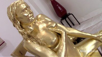 Amber exposes every inch of her sexy body as she covers herself in gold paint. Assistant Alana becomes turned on watching Amber and goes in from behind the camera and makes out with her.