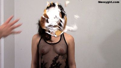 Amber is trying to resist the temptation of smashing pies in her face. She holds a pie, but places it back on the table. Then she takes it again and smashes the pie in her face. This sets her off a continuing stream of pies to her face. She never wipes her face, so she blindly reaches for the pies on the table. She becomes aroused and strips nude so she can rub the pie slop on her tits. She even pies her pussy a few times. After she has been creamed with 20 plus pies, she takes a can of whipped cream and sprays it in her mouth. After her mouth is full, she lets the cream ooze out. She finishes herself off by grinding her slippery pussy on the chair. Lucky chair!