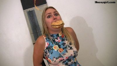 Amber is the first contestant of the Messygirl Extreme Games. She has to draw from a hat that contains pieces of paper with a dollar sign and the letter M for mess. Each dollar sign is worth $25, but if she picks the letter M, she will suffer a messy fate. She starts out well, with two dollar signs in a row, but then the first M is picked, and she gets a pie to the face. She suffers the same fate with various messes, such as beans, tomato soup, custard, flour and even treacle. She is still winning, but getting destroyed at the same time. Then she has to decide if she wants to go double or nothing. She takes on the bet, but loses, and now must suffer a sloppy humiliation. She is now nude and in the ankle stocks, with the force feeder funnel in her mouth. Next comes the slop mixture poured over her head and down her throat. Poor Amber sounds like a backed up sink from all the gurgling noises she makes.