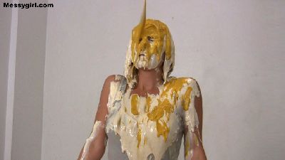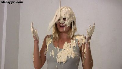 Justine has been baking all day and needs to decompress, and what better way to do so, than to get head to toe messy. Justine starts with pies to the face, and then takes off her dress and pulls down her panties to sit on a pie. She then pours four buckets of batter over her head. That is followed with a sexy nude wallowing in the mess.