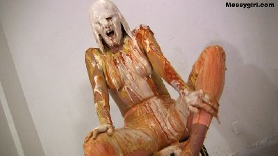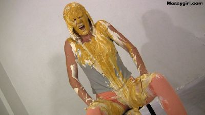 Penelope starts out nude and goes head first in the 5 gallon bucket of sticky fluff. She then starts to coat her sexy body and face until she is an unrecognizable blob. Once covered, she masturbates until she cums.