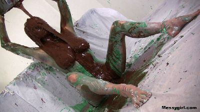 Deni starts out wearing white jeans and a white top. She is pied first and then takes a bucket of hot pink slime over hear head. She is ordered to take off her top and gets more slime. Once totally covered, she takes off her jeans and pulls down her panties for a pie to the ass and gets a wedgie. Deni then goes nude for more pies and a chocolate sliming. Finally she is instructed by Vika to play in the mess on the floor.