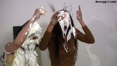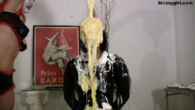 Liz is in a sexy white corset a see through skirt, thong panties and heels as she is destroyed with pies, batter and slime.
