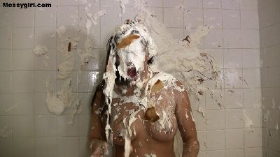 Kerri Taylor is attacked in the shower with a barrage of pies hard to the face and then has a gallon of chocolate batter poured over her head.