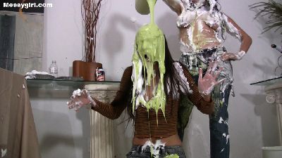 Liz gets messy and naughty in and out of her swimsuit. Total coverage with pies, slime and chocolate.