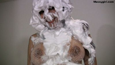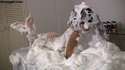 Hannah Perez is wearing a mess top and thong panties as she dives face first into a bed of shaving cream, She rolls around and strips nude until she is covered head to toe, Then she goes face first in chocolate batter.