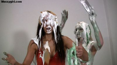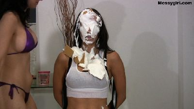 Amy is telling Liz not to eat crackers on her new sheets. When Liz has had enough of her bitching about it, she proceeds to hogtie Amy and destroys her and her sheets at the same time with pies, chocolate batter and custard. Liz unties Amy when she thinks she has had enough. Both girls then get into some erotic play time in the slop.