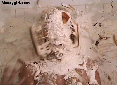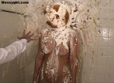 Busty Mai's relaxing shower turns into a pie attack. Mai is creamed head to toe.