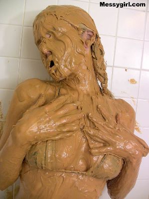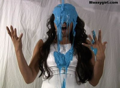 Sexy Angela takes on gallons of batter slime as she sits nude in the bath tub. Her pretty face is engulfed in the thick mess.