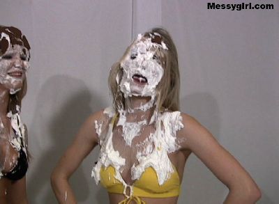 Sexy Christina returns and this time she brings her friend Titania. Both girls are in bikinis as a tit for tat pie fight breaks out. They end up nude and even play around in the left over pie slop.