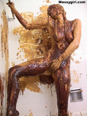Liz covers herself head to toe in gooey peanut butter and then tops it off with chocolate syrup.