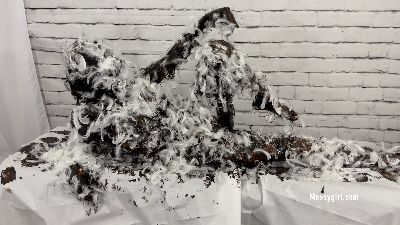 Young 19 year old Cassandra does the most disgusting thing in her life and that is becoming a human garbage disposal. Great reactions from her as she is covered in savory slop.