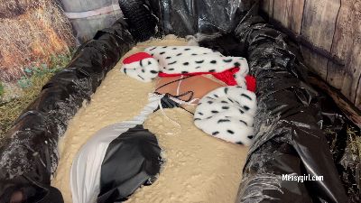 Penelope plays Cruella de Vil looking for dogs at a farm. One of the dogs bites her on the ass and she falls face first into the a large troff of pig slop. She is outraged as she tries to get out, but keeps fallings back in.